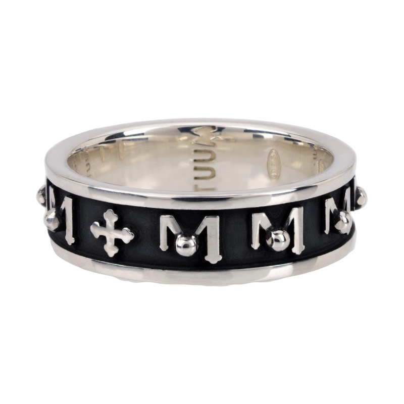 DECEM. Rappresenta l’innovativa interpretazione TUUM dell’anello rosario. Realizzato in argento brunito, rodiato, oro 9 kt e 18 kt (nelle 3 differenti colorazioni). Disponibile anche con 10 diamanti posizionati manualmente in ogni «Ave Maria» con un particolare metodo di incassatura.