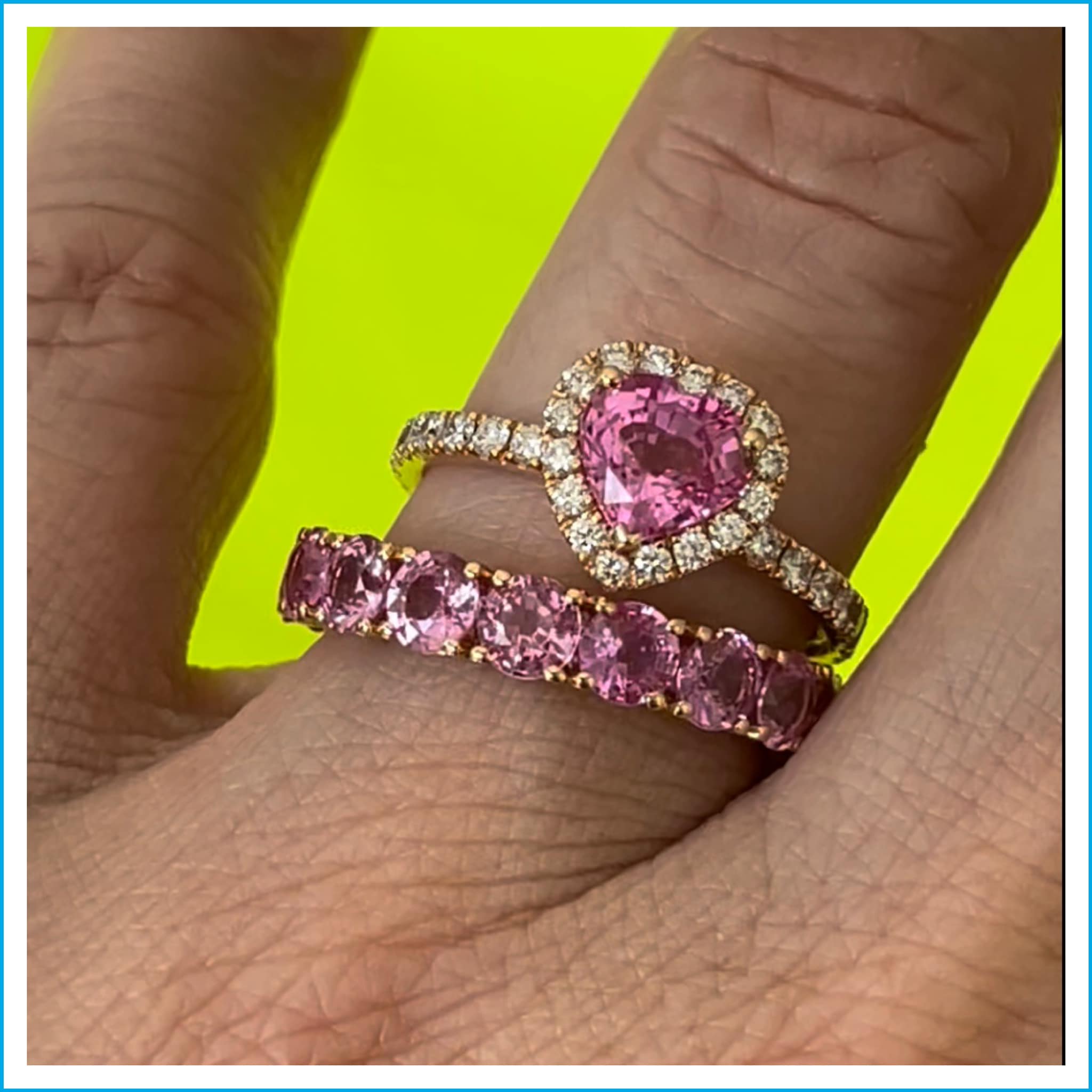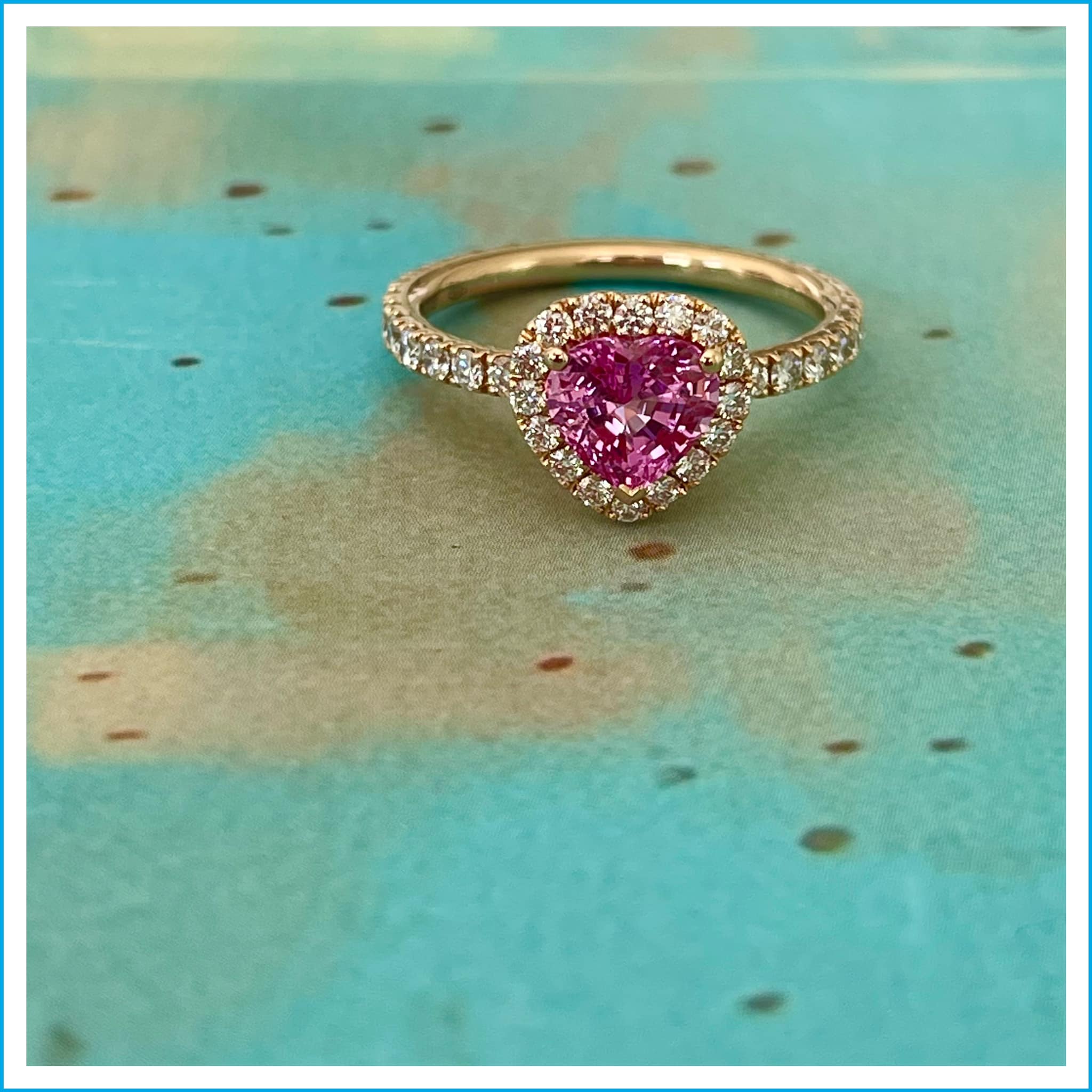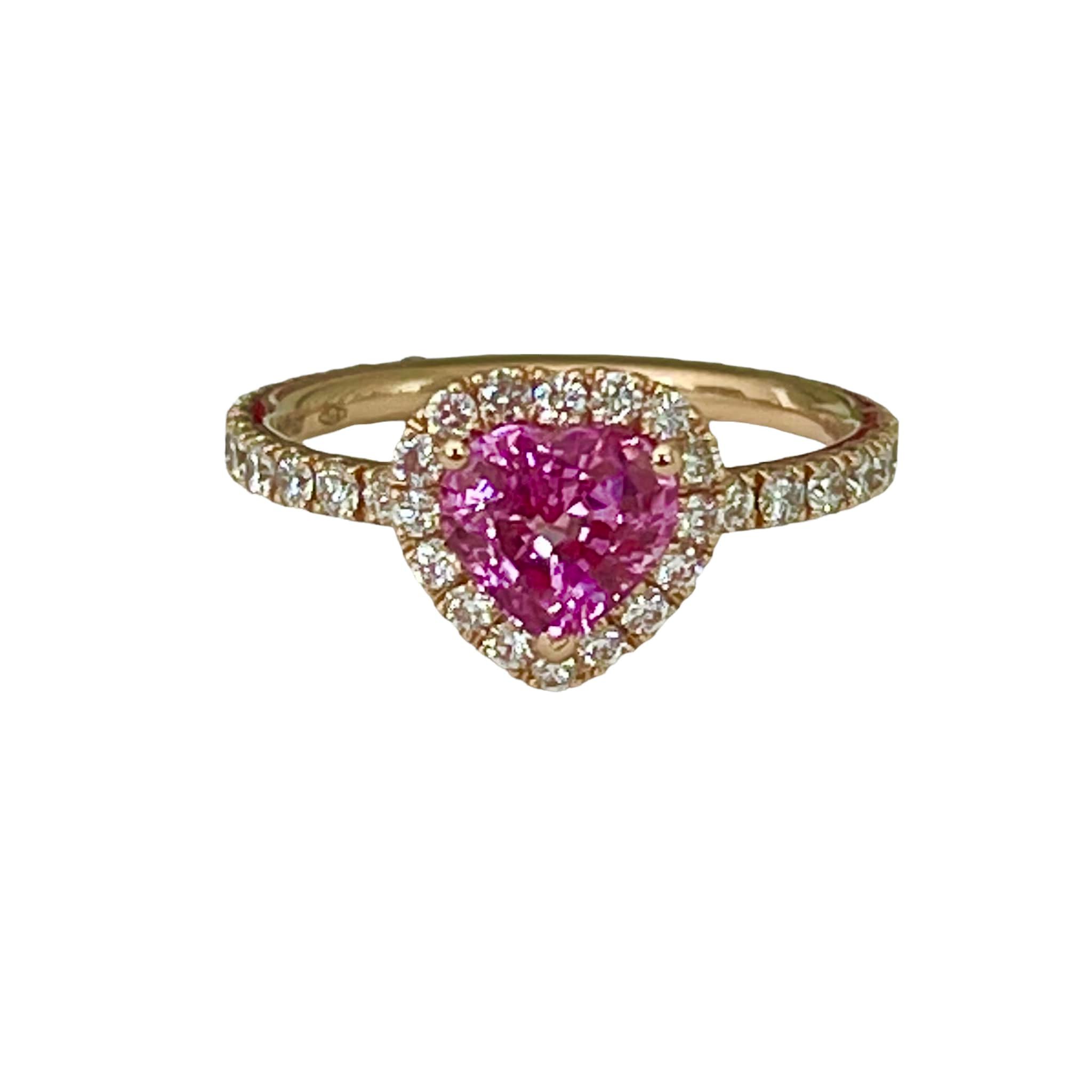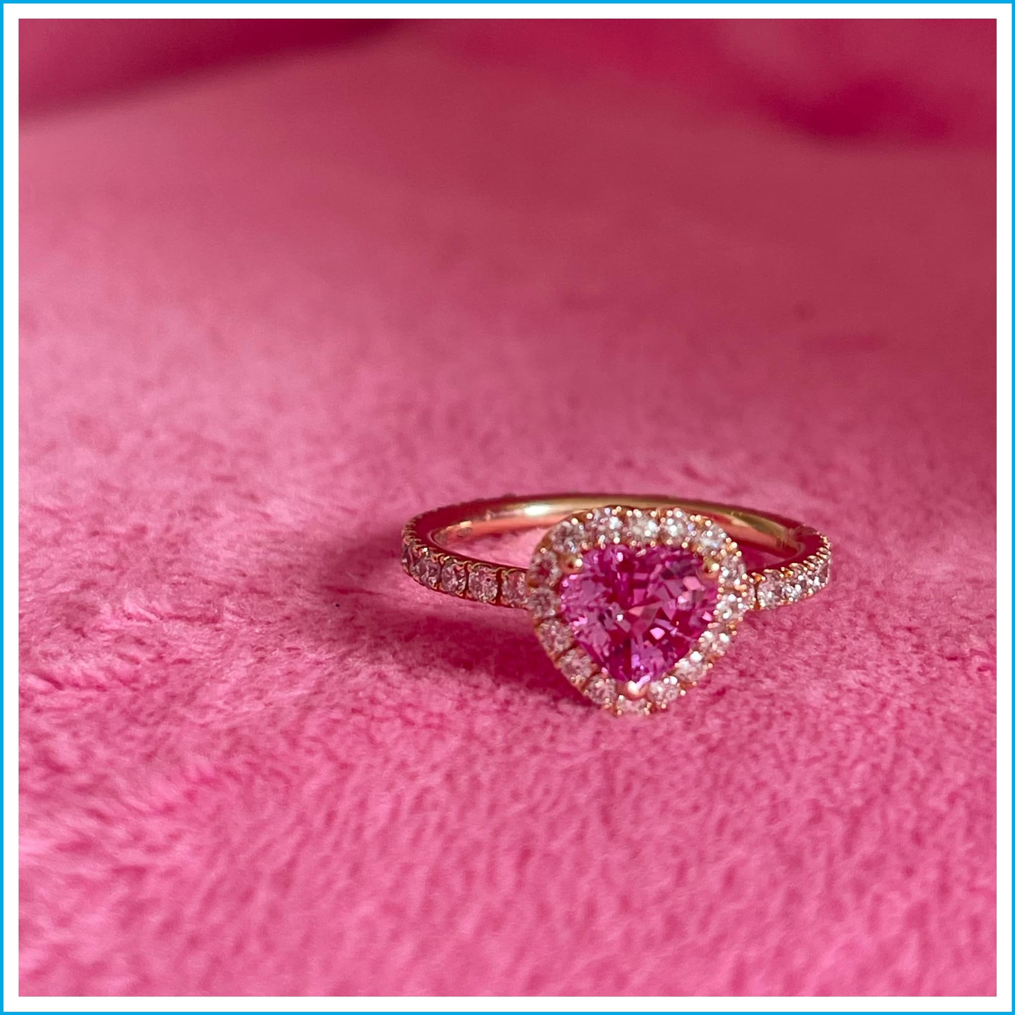Anello in oro rosa 18kt con Zaffiro rosa taglio cuore e contorno diamanti.