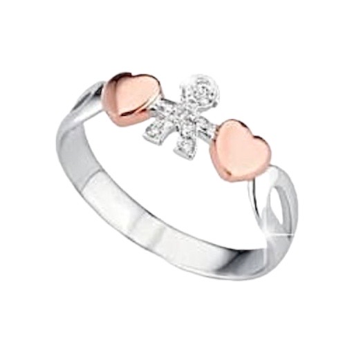 Anello Girocuore in Oro Bianco 18kt con cuori in Oro Rosa 18kt e sagoma Bimba in pavé di diamanti.