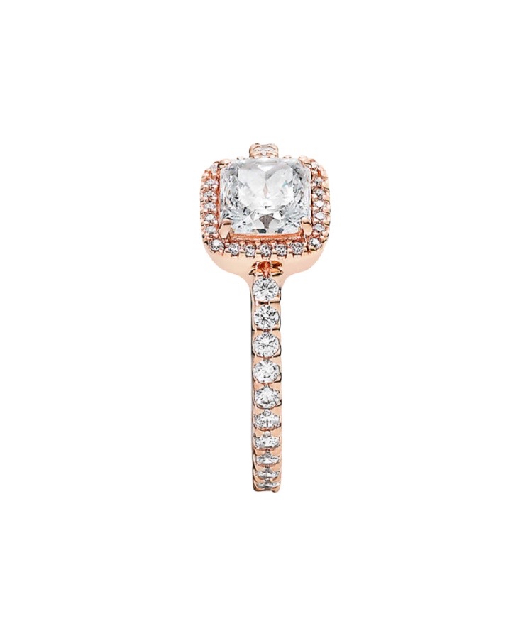 Abbraccia la tendenza dei gioielli ispirati ai cimeli di famiglia con questo splendido design a corona. Decorato da una zirconia cubica taglio danubio circondata da pietre scintillanti, questo fastoso anello rosa reinterpreta lo stile vintage in chave moderna ed è perfetto per ogni occasione.