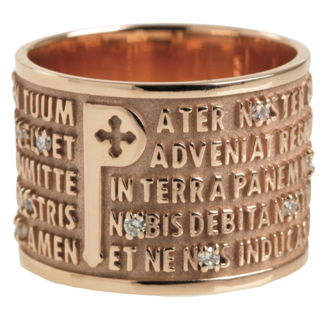 ORIGINE. Gli anelli della «Collezione Origine» riproducono in rilievo la preghiera del Padre Nostro nella lingua Latina.