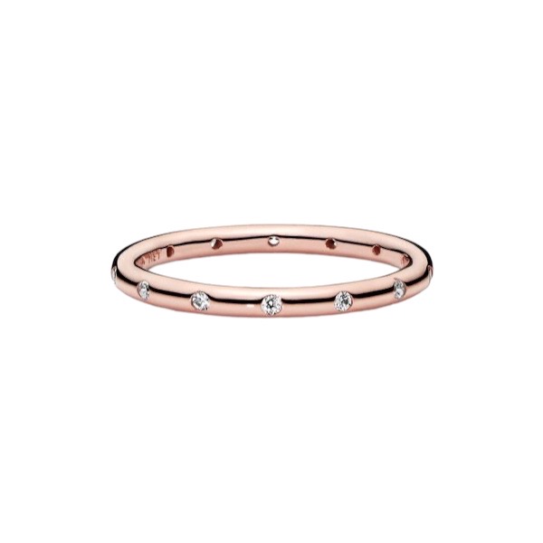 Aggiungi un tocco di delicata brillantezza a ogni outfit con il nostro anello a fascia scintillante semplice con placcatura in oro rosa 14k, rifinito a mano e lucidato fino ad assicurare la massima brillantezza. Il classico anello simbolo di eternità è decorato da sfavillanti pietre di zirconia cubica. Semplice ma raffinato, è perfetto sia indossato da solo che abbinato ad altri anelli Pandora in tonalità metalliche a contrasto.