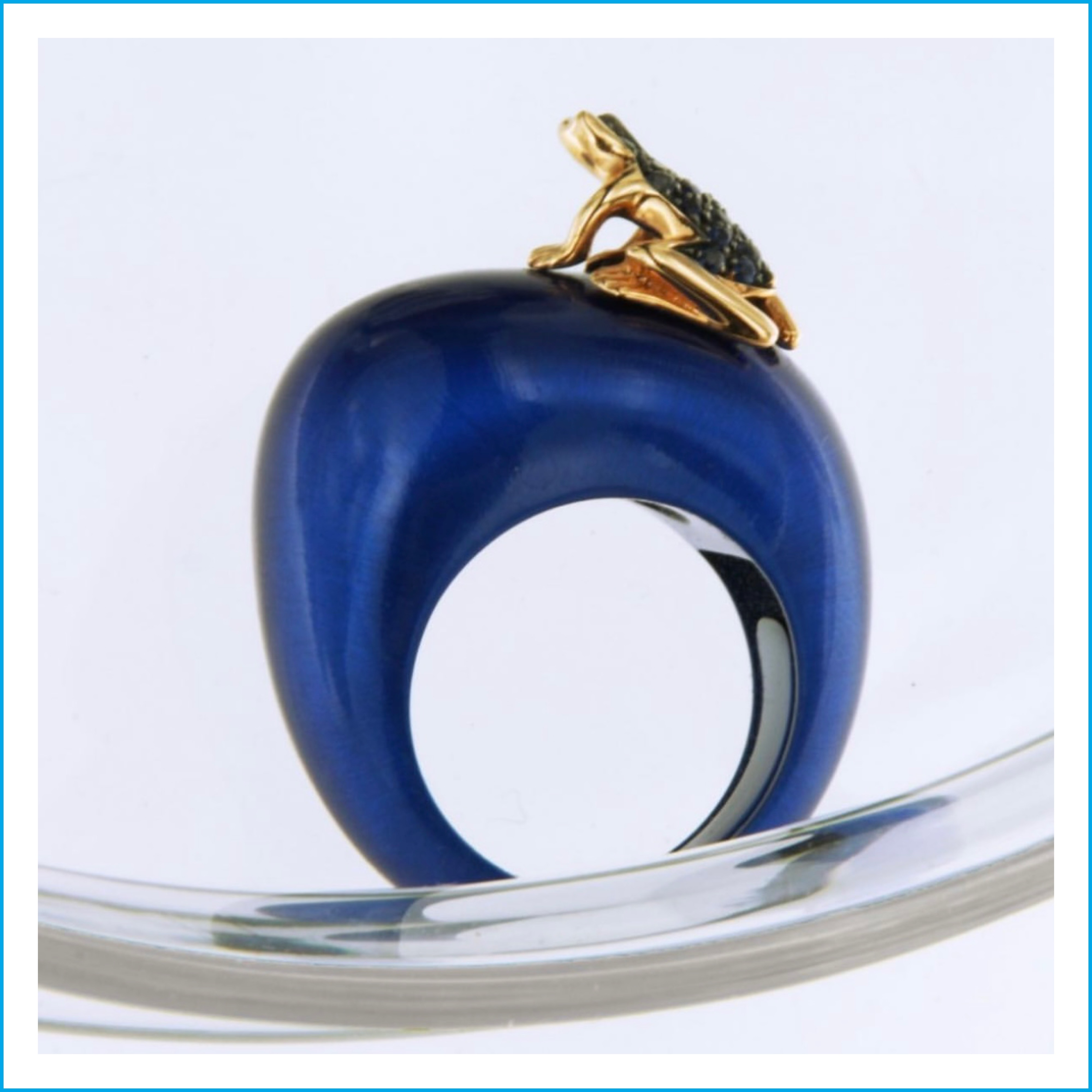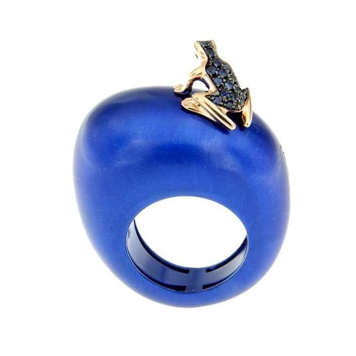 L'anello scultura dell'iconica collezione Happy Frog ha la base in argento 925 il cui colore e' ottenuto mediante un trattamento elettrolitico chiamato cataforesi. La rana è in oro 18kt e zaffiri.