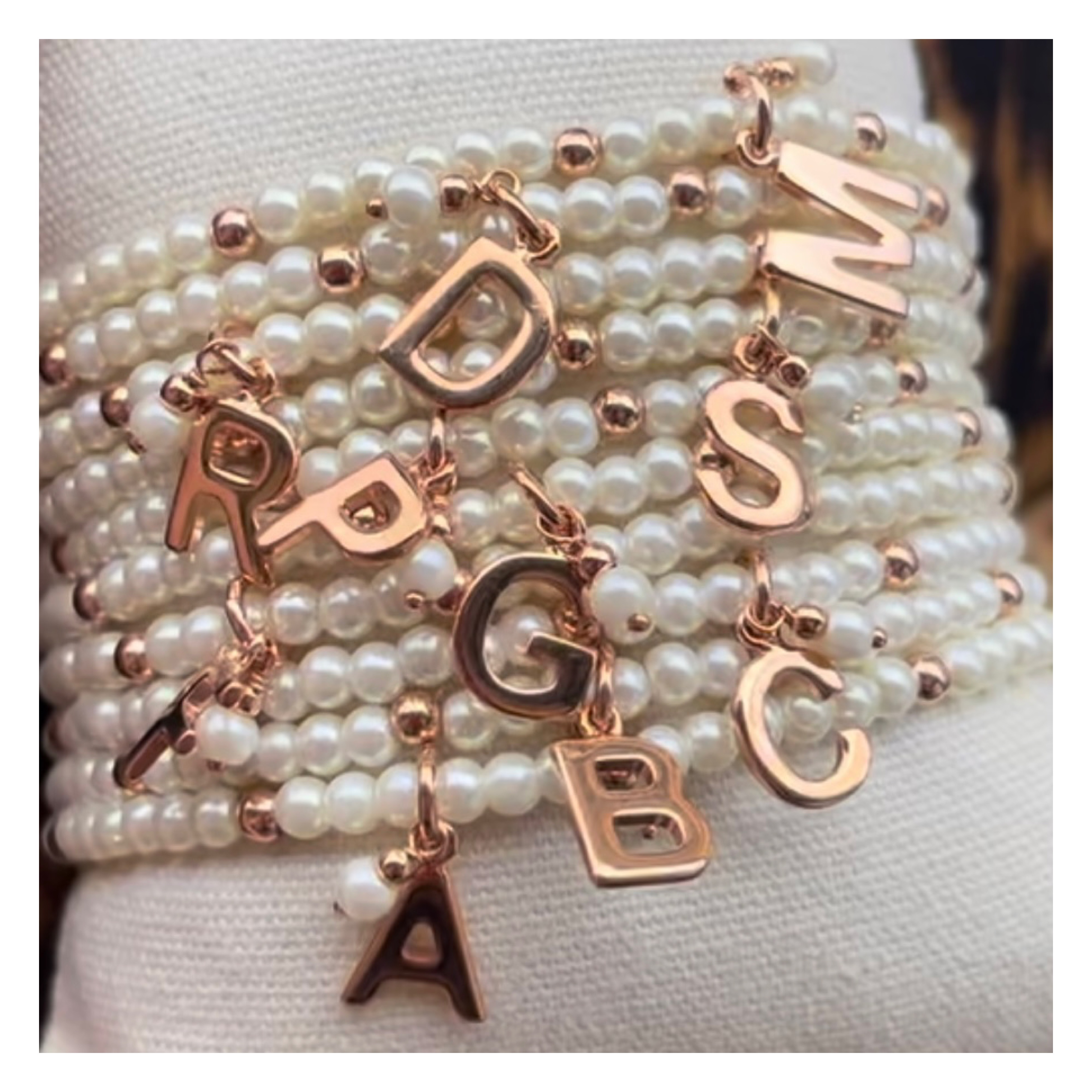 Braccialetto elastico con perle e palline in argento. La tua lettera del cuore sempre con te.