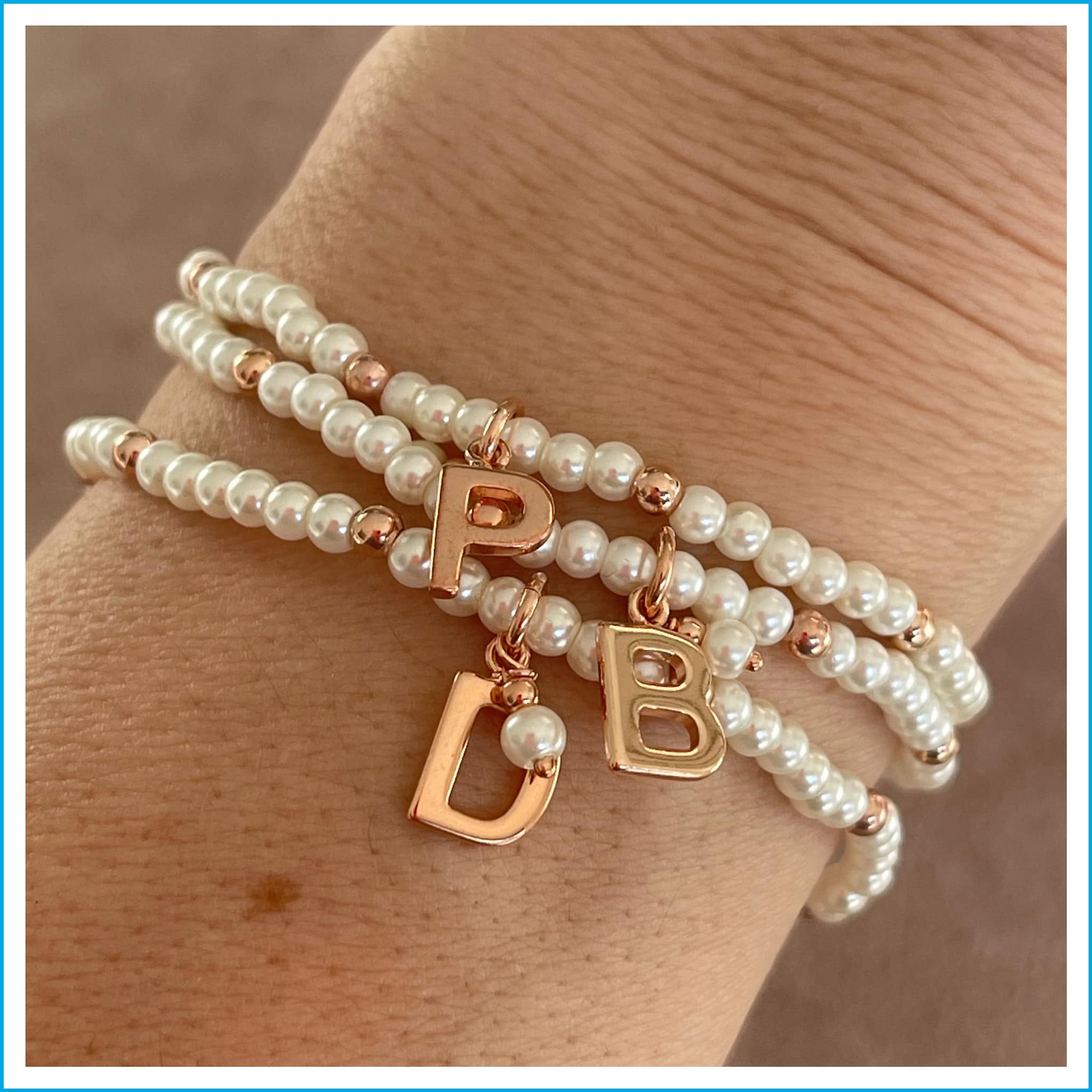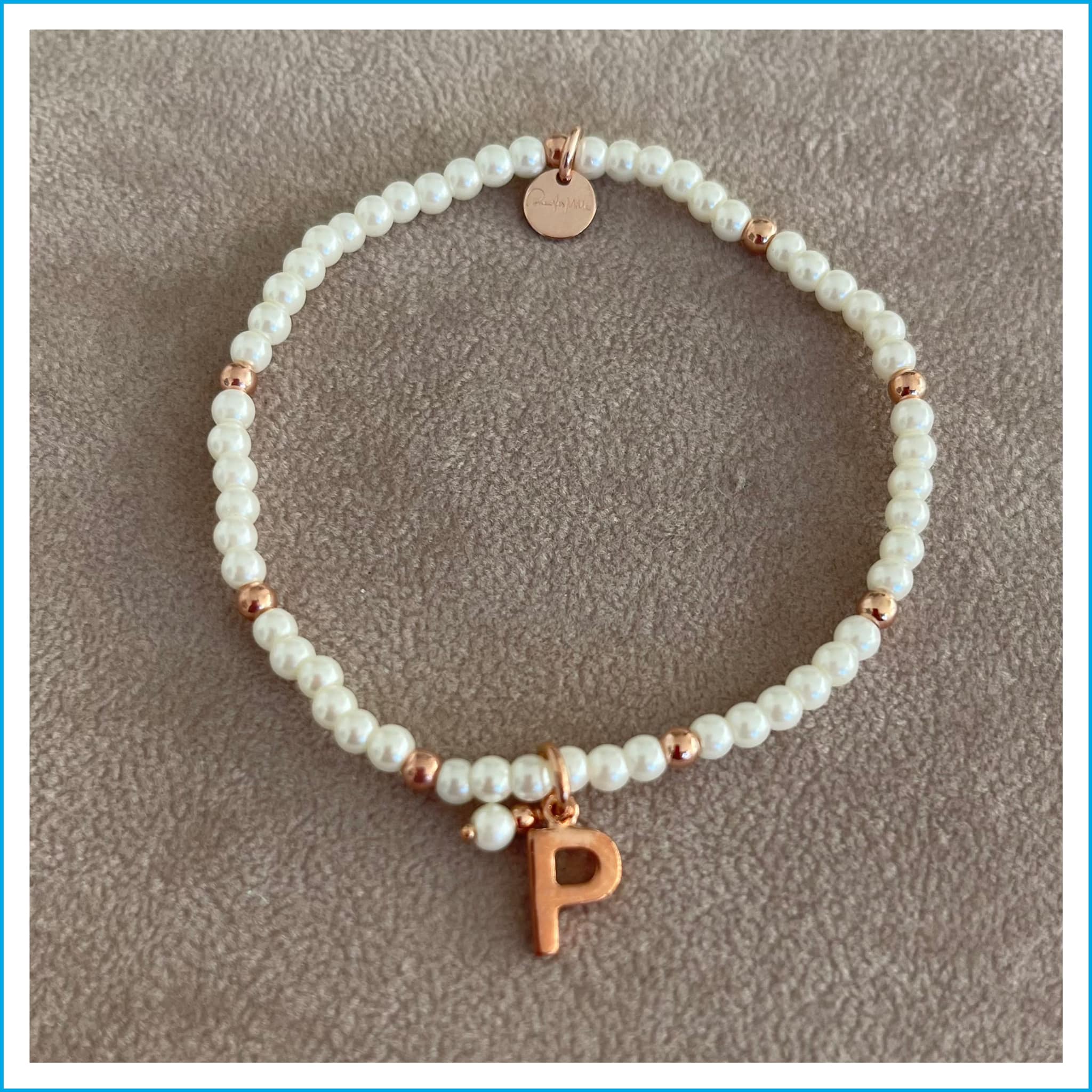 Braccialetto elastico con perle e palline in argento. La tua lettera del cuore sempre con te.