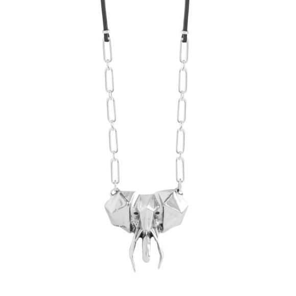 Collana wako in pelle nera e catena con soggetto elefante geometrico in metallo bagnato in argento.