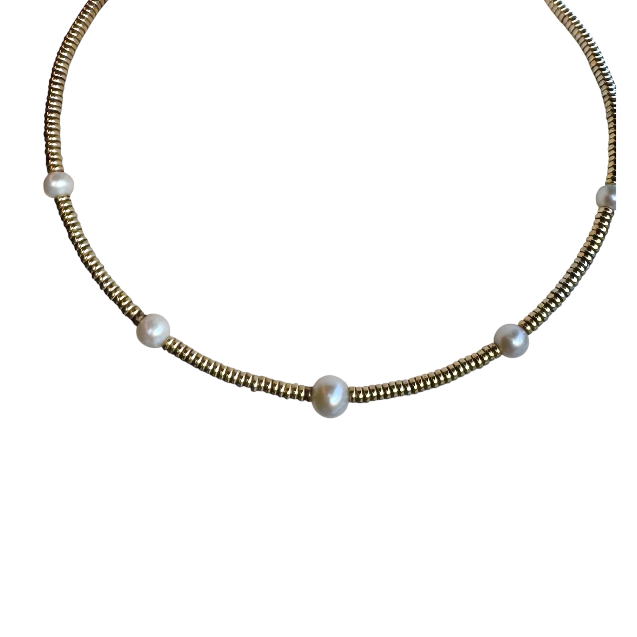 Girocollo in argento dorato con perle bianche.