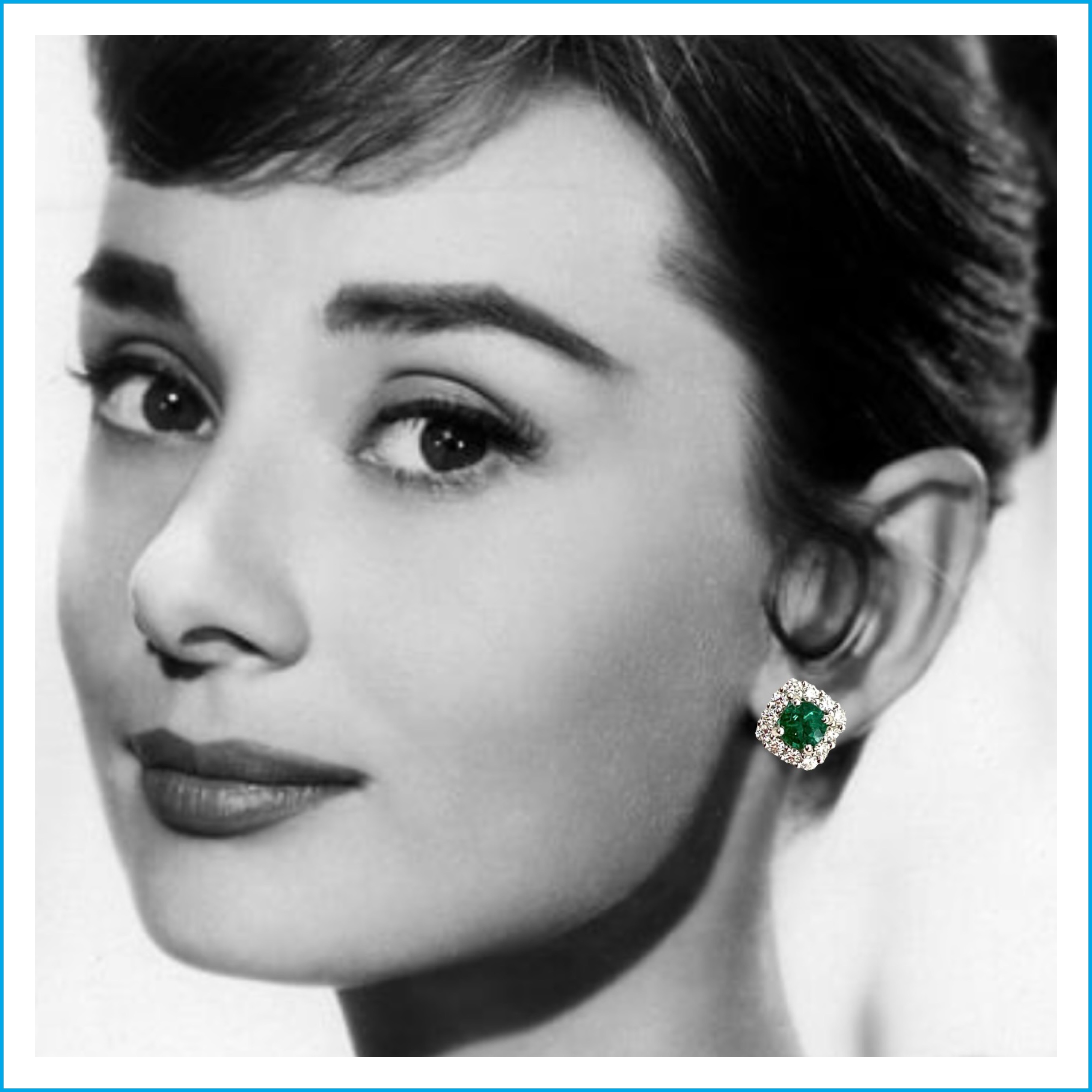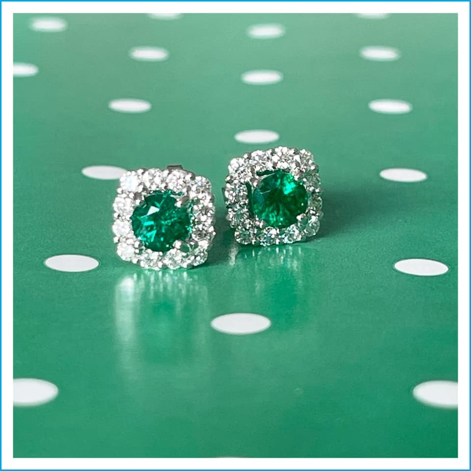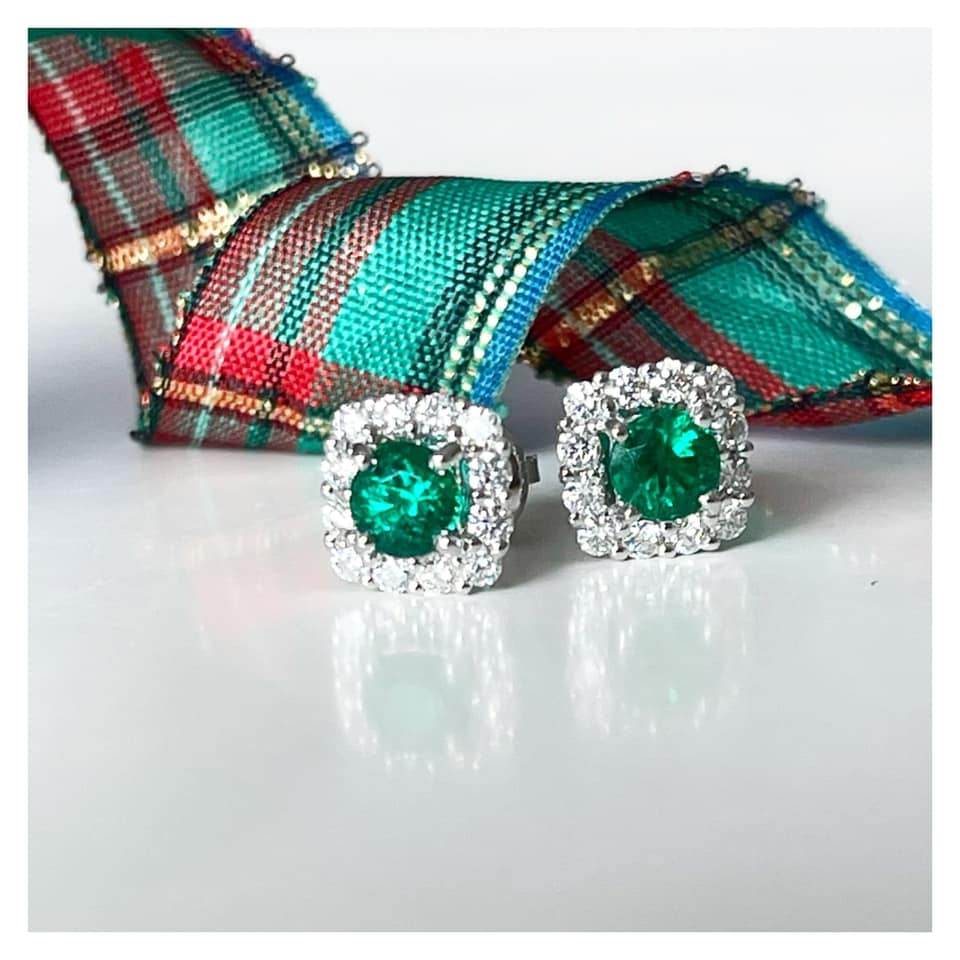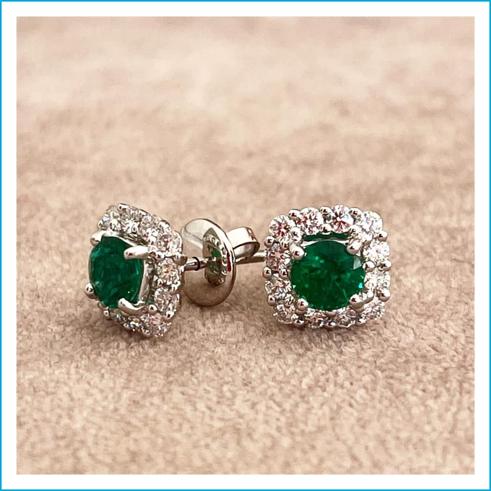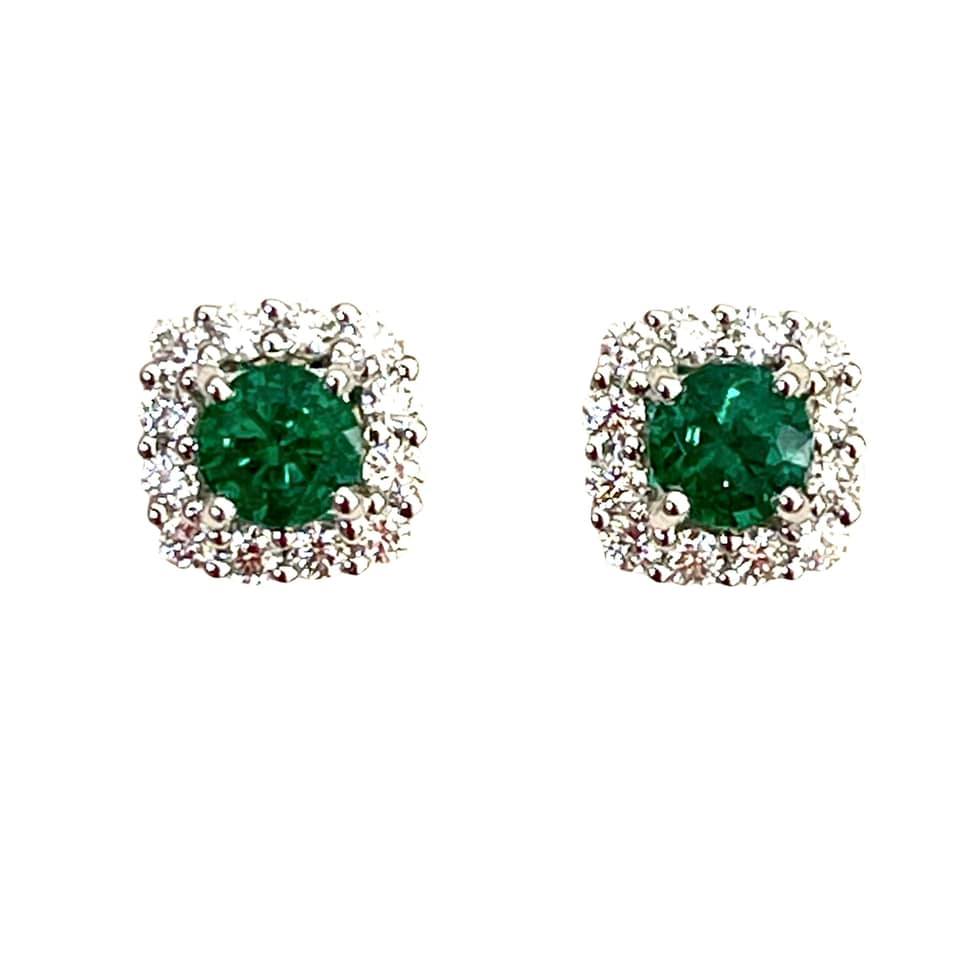 Orecchini a lobo in oro bianco 18kt con smeraldi taglio rotondo con pavè di diamanti quadrato.