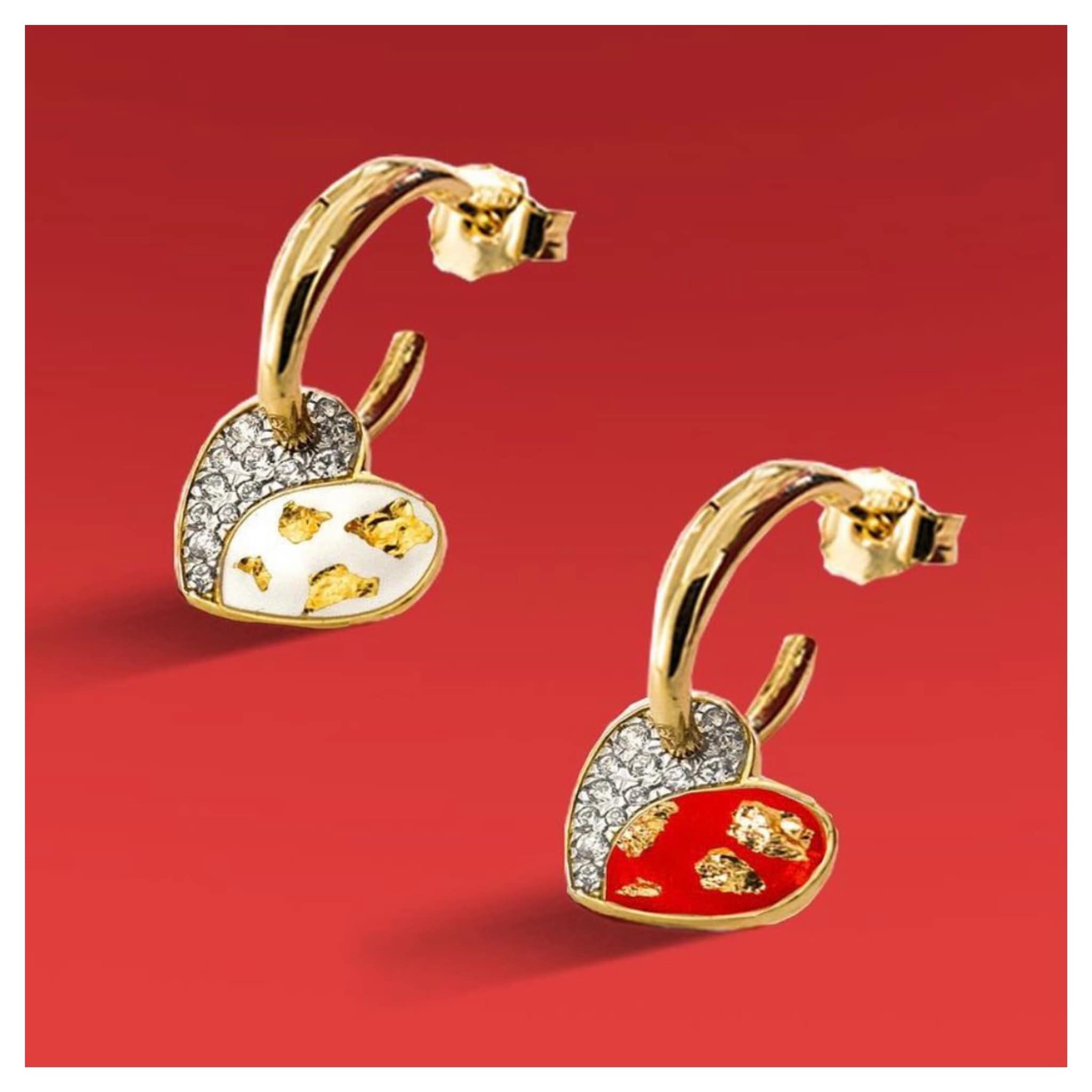 Orecchino singolo con cerchietto pendente e ciondolo cuore con zirconi bianchi e smalto rosso foglia d'oro. La smaltatura viene fatta a mano con tre passaggi : una smaltatura di colore, una foglia d'oro 18kt e un ultimo passaggio di smalto trasparente.