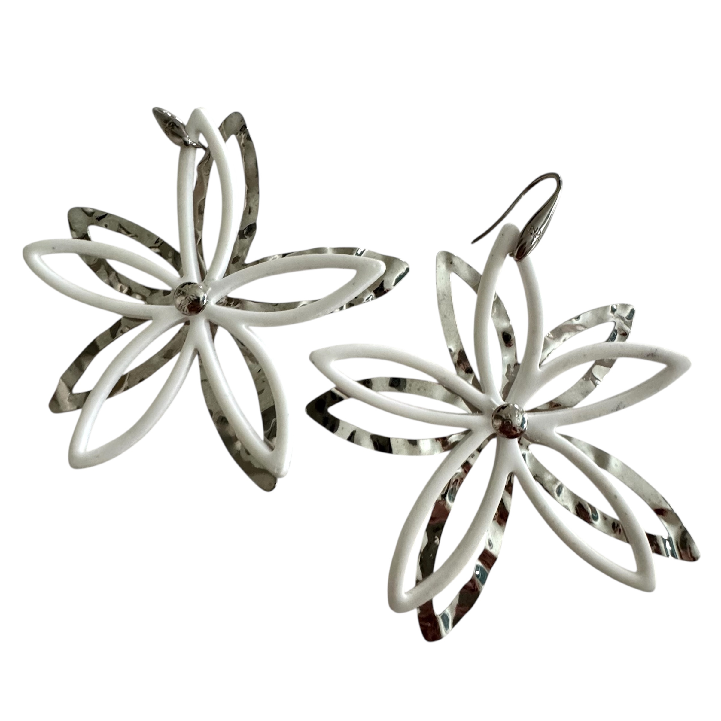 Orecchini bianchi pendenti fiori grandi in acciaio e silicone.